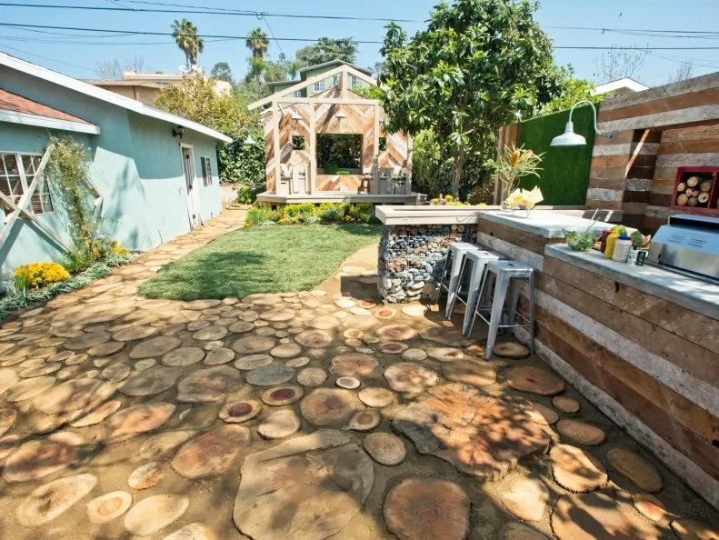 I want a modern backyard design with trees, green grass, and automatic irrigation system.
