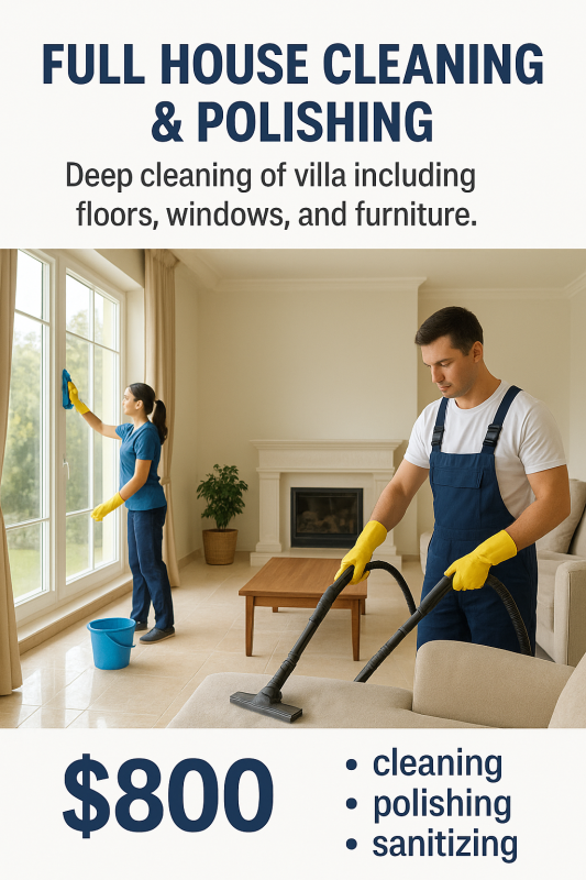 Villa cleaning with steam machines, window cleaning, and floor polishing.